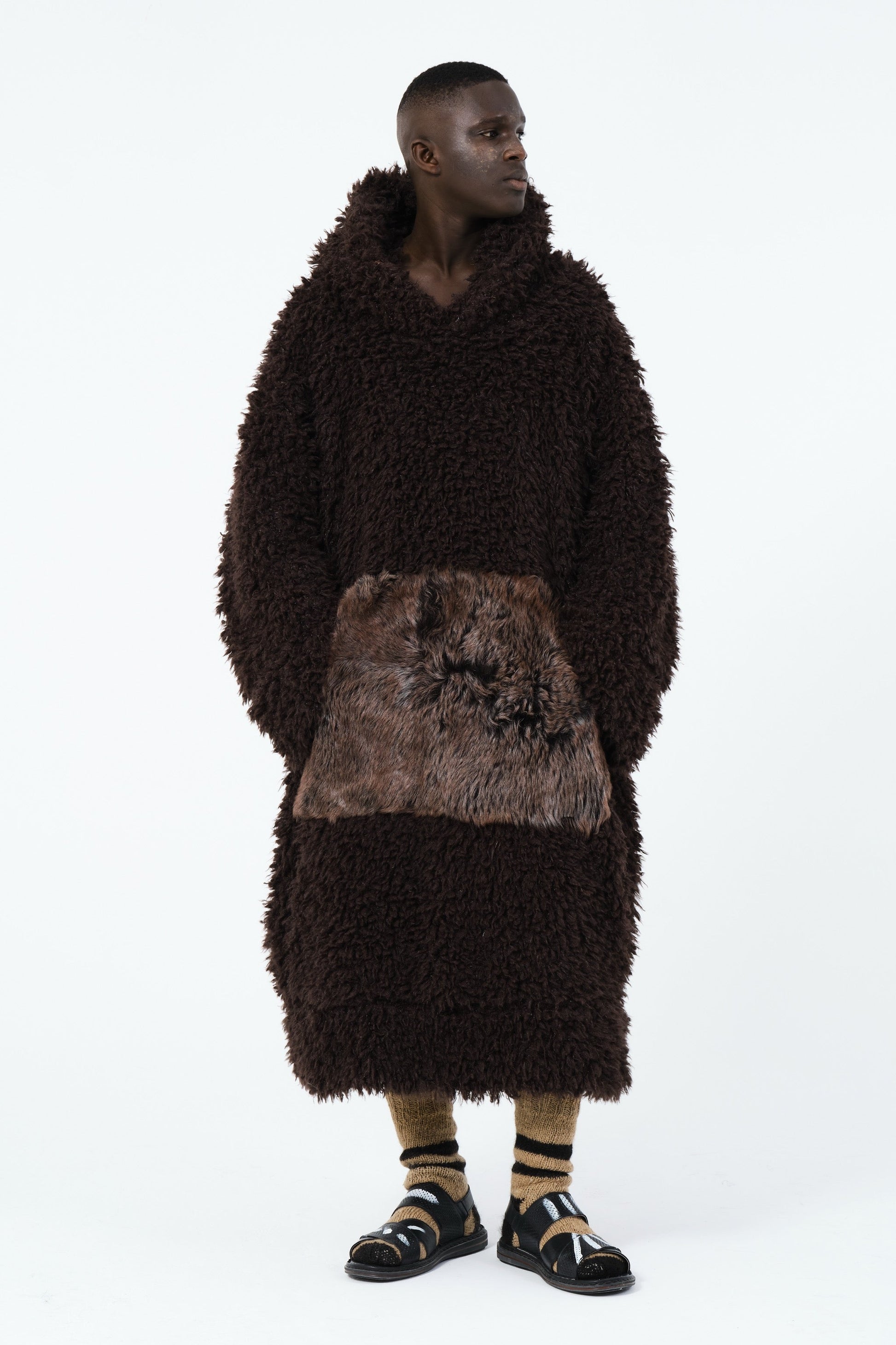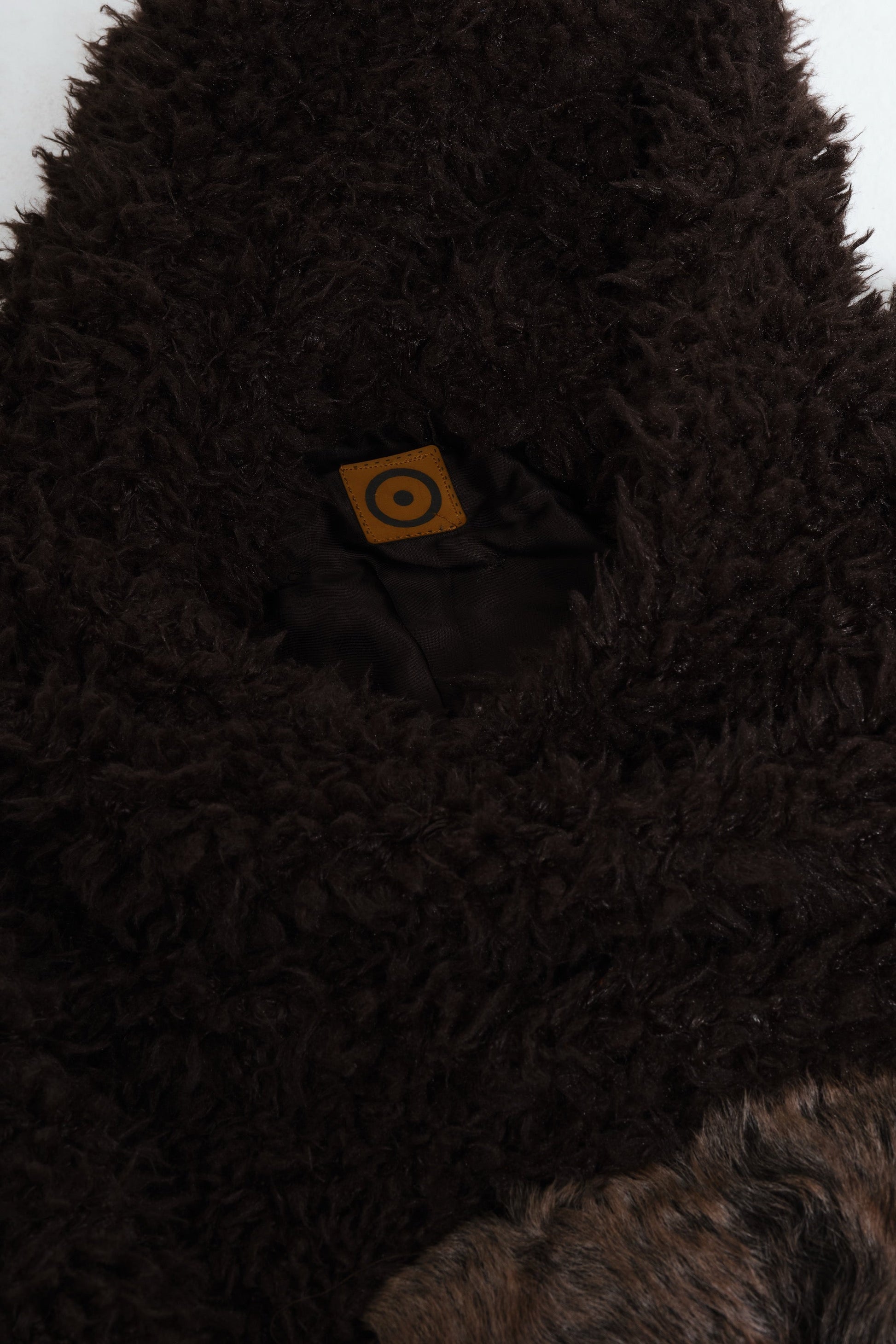Momo Henge showcases a back design in earthy tones and shapes drawing inspiration from the captivating lines and forms of Arctic Henge structures. Crafted from deep brown fabric and complemented by a textured furry front pocket, it embodies a blend of raw natural forms and architectural intrigue.